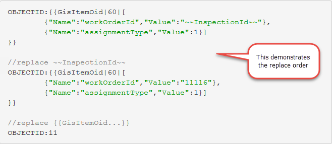 The properties included in the template are replaced with real Trimble Unity data once the action is triggered according to an "order of operations" algorithm. The replace order is ``property``, ~~property~~, {{property}}.