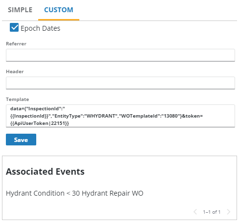 Use the Custom tab if you'd like to configure your own webhook with a number of different values and actions available. This allows you to link and configure custom workflows in Trimble Unity and in conjunction with third parties that aren't currently supported.