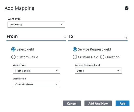 An asset mapping can be created on two events: when an asset is added to a service request or when the service request is closed.