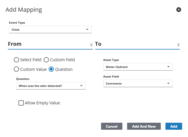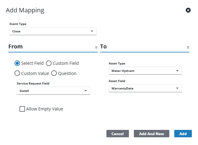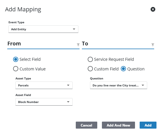 Asset mappings can be added to specific service request templates to populate fields from the GIS when assets are added to a service request or to update the GIS when the service request is closed.