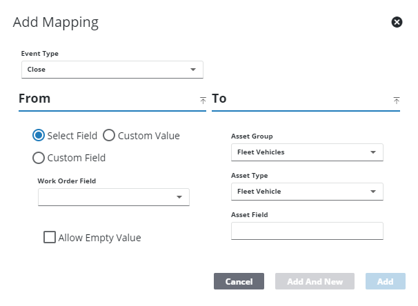 An asset mapping can be created on two events: when an asset is added to a work order or when the work order is closed.