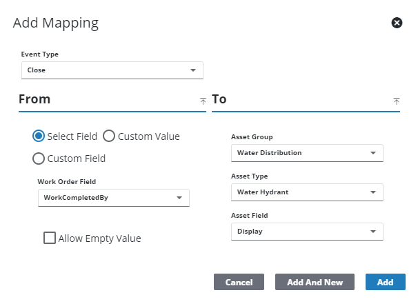 Asset mappings can be added to specific work order templates to populate fields from the GIS when assets are added to a work order or to update the GIS when the work order is closed.