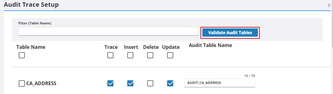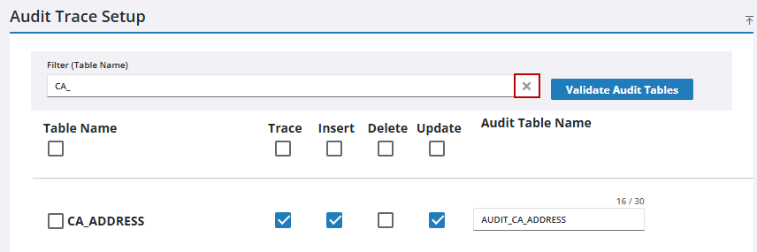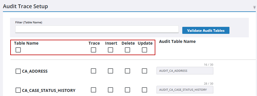 TIP: To limit the number of tables displayed, enter the first few letters of the table name you want to configure in the Filter (Table Name) field on the Audit Trace Setup panel and observe the search results. To see all available tables, leave the Filter (Table Name) field blank (or reset it by clicking X, and scroll down the page.