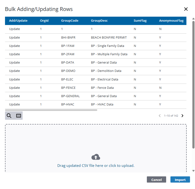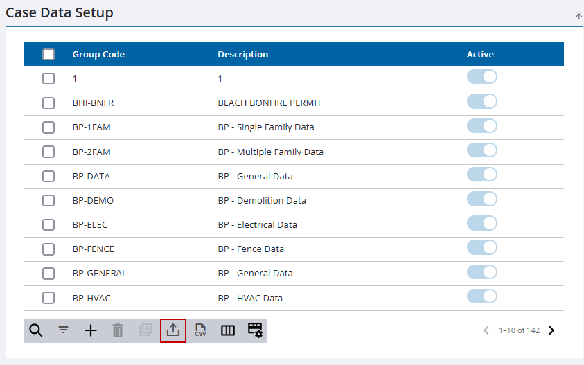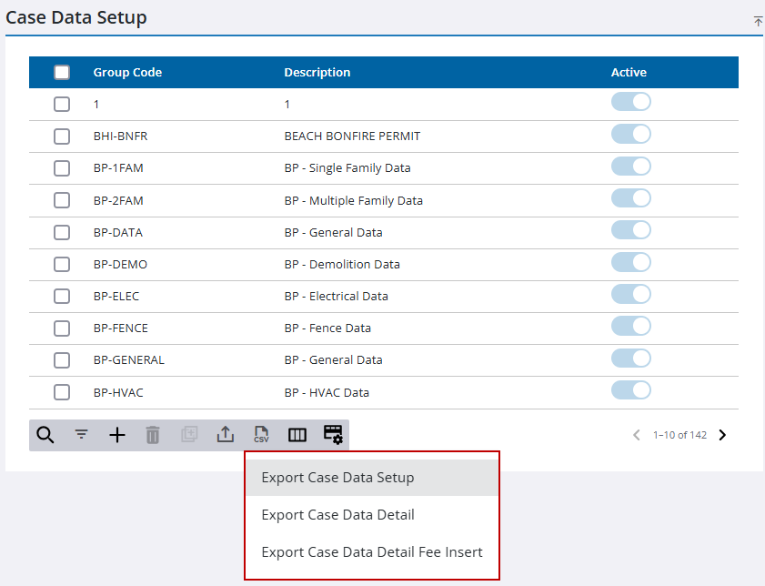 Multiple case data records, case data detail records, or case data detail fee records can be exported or imported at once using CSV files. Bulk import actions can be used for adding new records and editing existing records.