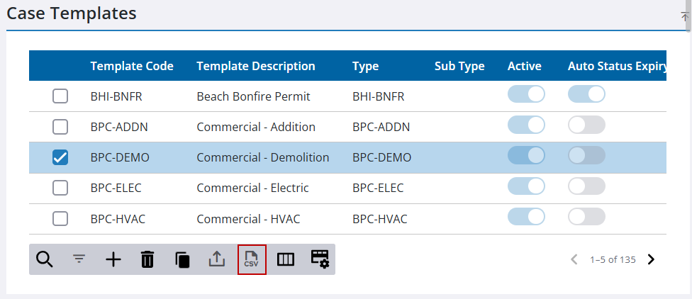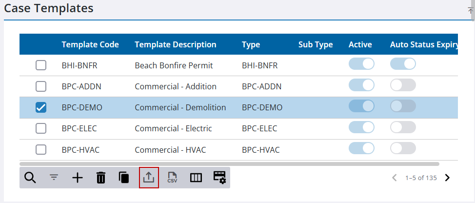 - On the Case Templates panel, select the entry or entries you want to export data for.