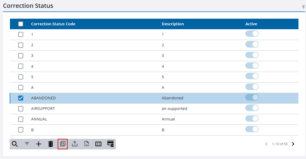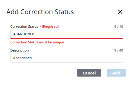 - On the Add Correction Status panel, update the name in the Correction Status field (10-character maximum).