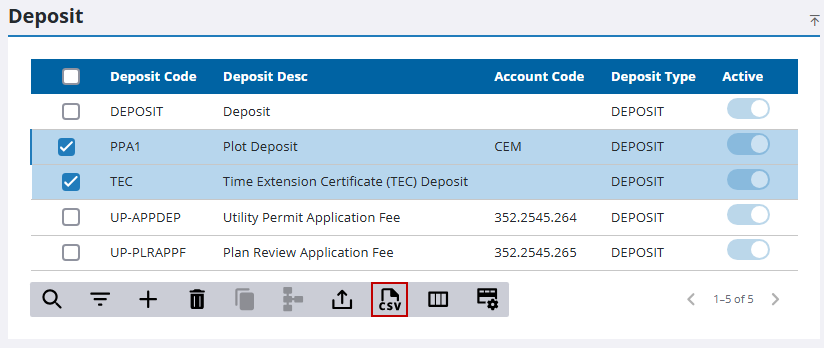 - On the Deposit panel, select the entry or entries you want to export data for.