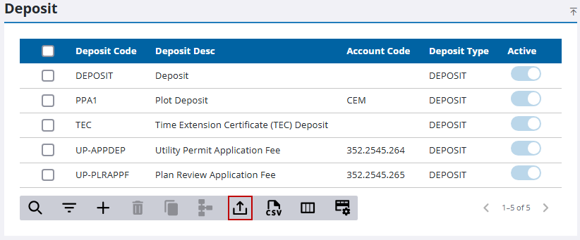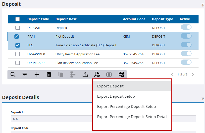 - Make a selection from the download option menu: Export Deposit, Export Deposit Setup, Export Percentage Deposit Setup, or Export Deposit Setup Detail.