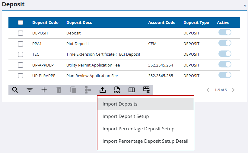 - Select the option that matches the content of your CSV file. You can choose from Import Deposits, Import Deposit Setup, Import Percentage Deposit Setup, or Import Percentage Deposit Setup Detail.