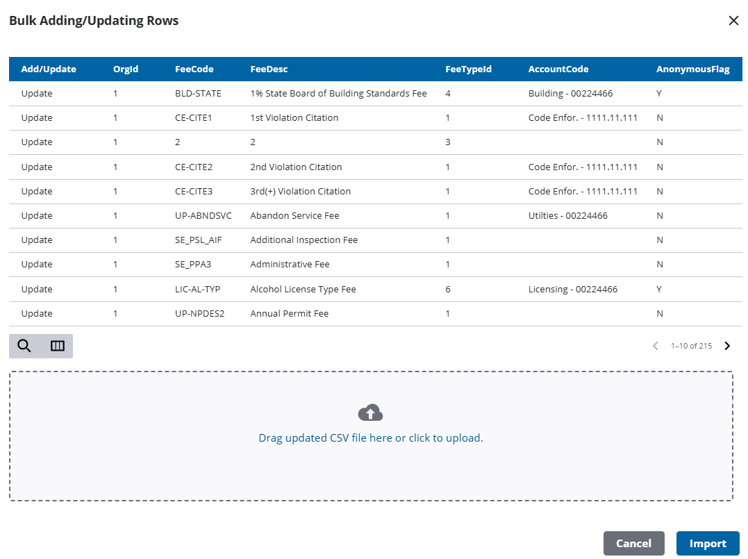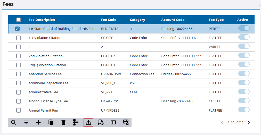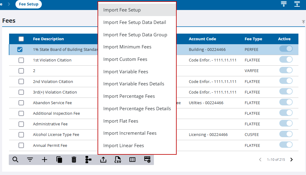 Multiple fee records can be exported or imported at once using CSV files. Bulk import actions can be used for adding new records and editing existing records.