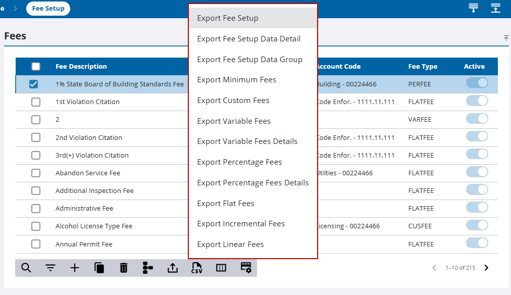 - Make a selection from the download option menu: Export Fee Setup, Export Fee Setup Data Detail, Export Fee Setup Data Group, Export Minimum Fees, Export Custom Fees, Export Variable Fees, Export Variable Fees Details, Export Percentage Fees, Export Percentage Fees Details, Export Flat Fees, Export Incremental Fees, or Export Linear Fees.
