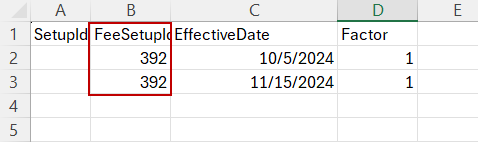 Multiple entries can be added to the CSV import file at once. For example, if you want to add two new child entries to a parent table that has a FeeSetupId of 392, enter 392 in two separate rows of the FeeSetupId, then populate the desired data in the other columns.