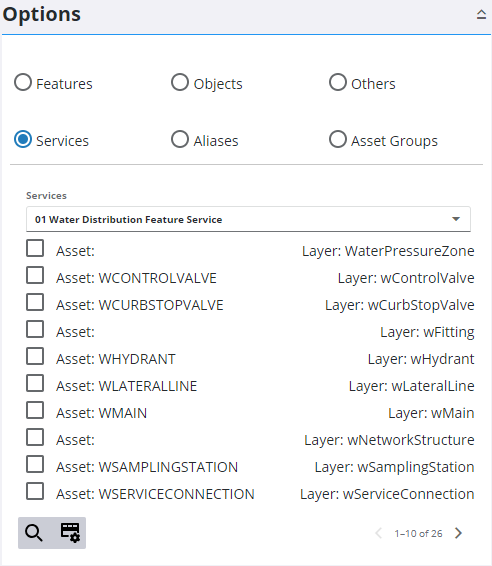Use the Services option to view a list of services in the database. When a service is selected, the Options panel displays a list of layers that are a part of the service and the asset that each layer resolves to (if any).