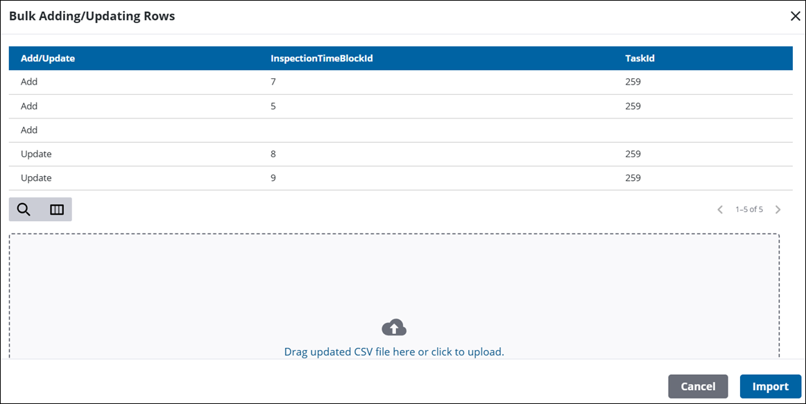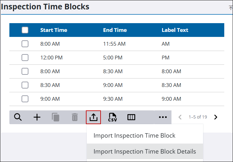 - Select the option that matches the content of your CSV file. You can choose from Import Inspection Time Block and Import Inspection Time Block Details.