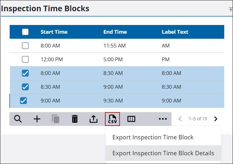 - On the Inspection Time Blocks panel, select the entry or entries you want to export data for.
