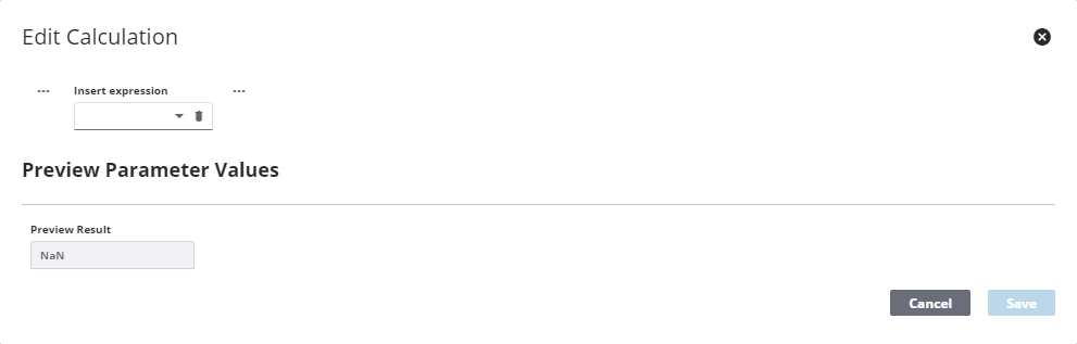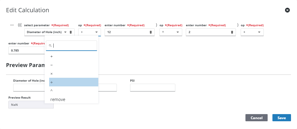 - In the Edit Calculation panel, create the calculation by selecting values from the drop-down lists. To create the calculation, you can choose to insert numbers or answer values based on observation answers entered at the time of the inspection, along with an operator (+, -, *, /, ^). You can insert additional expressions (a group of numbers or variables along with an operator), such as (2 + 5), to create a more complex calculation.
