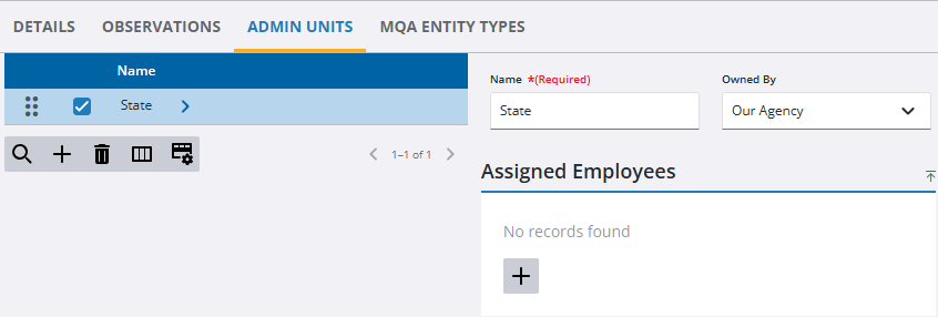 - Click Add record in the Assigned Employees panel to associate an employee with the selected admin unit.