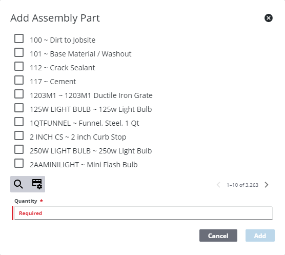 - Select the part(s) from the list. You can filter the list by typing the first few letters of the assembly part in the search field.