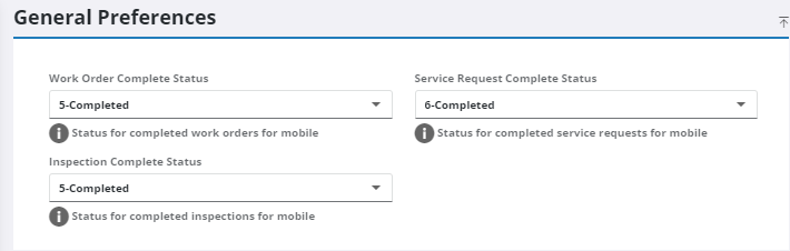 - In the Work Order Complete Status field, select a status to set work orders to when they are completed in the mobile apps.