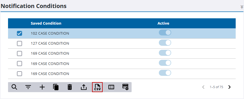 - On the Notifications Conditions panel, select the entry or entries you want to export data for.