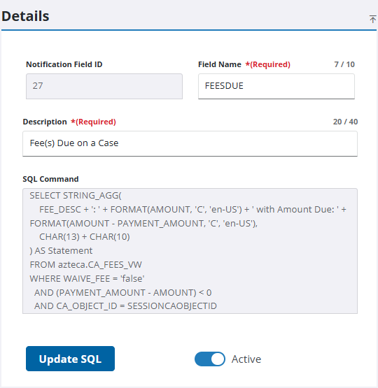 - The Active switch is turned on by default. To preserve historical data and maintain integrity, turn off the Active switch rather than deleting the record. See Remove a Notification Field for more information.