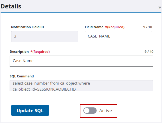 - Turn off Active in the Details panel to make the notification field unavailable to users.