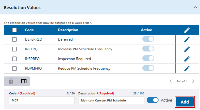 - At the bottom of the Resolution Values section, enter the Code and Description.