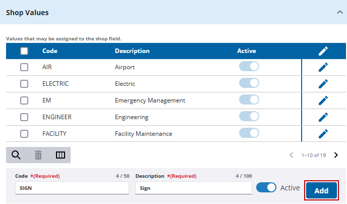 NOTE: If configuring a GIS layer to auto-populate these values, you must add all potential Shop values from the GIS layer to this code list. If all values are not represented in this code list, the auto-population does not work.