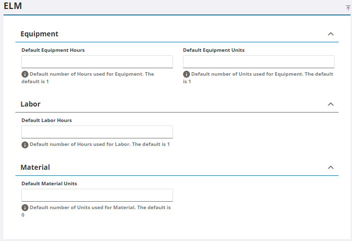 The ELM panel contains default preferences that can be set for equipment, labor, and material on the ELM page in Respond.