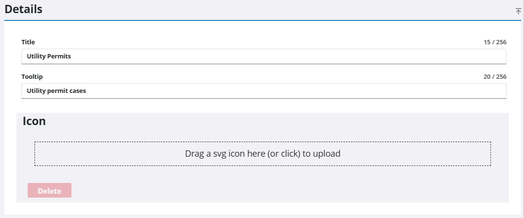 - To add an image, either click the box in the Icon section to browse to the file or drag a file and drop it where it says Drag a svg icon here (or click) to upload.