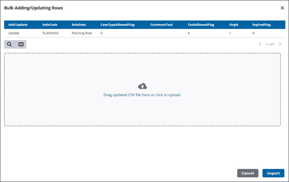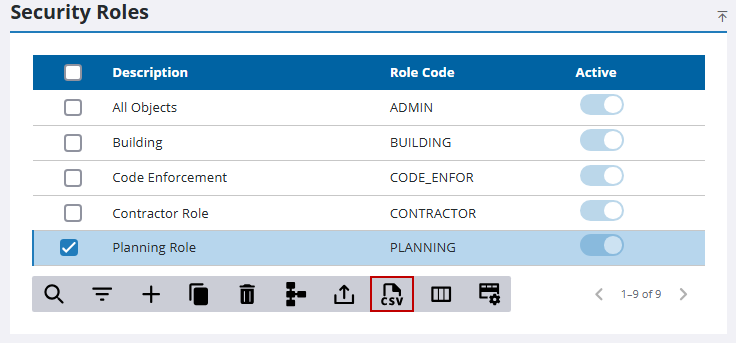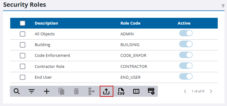 Multiple security roles can be exported or imported at once using CSV files. Bulk import actions can be used for adding new records and editing existing records.