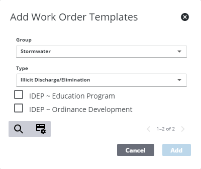 - Select a wok order from the list on the Add Work Order Templates panel. You can begin filtering the list by clicking Filter records and typing the first few letters of the work order template.