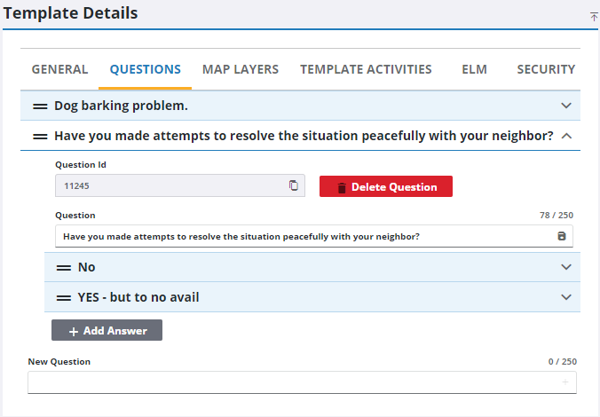 - Click the Questions tab on the Template Details panel.