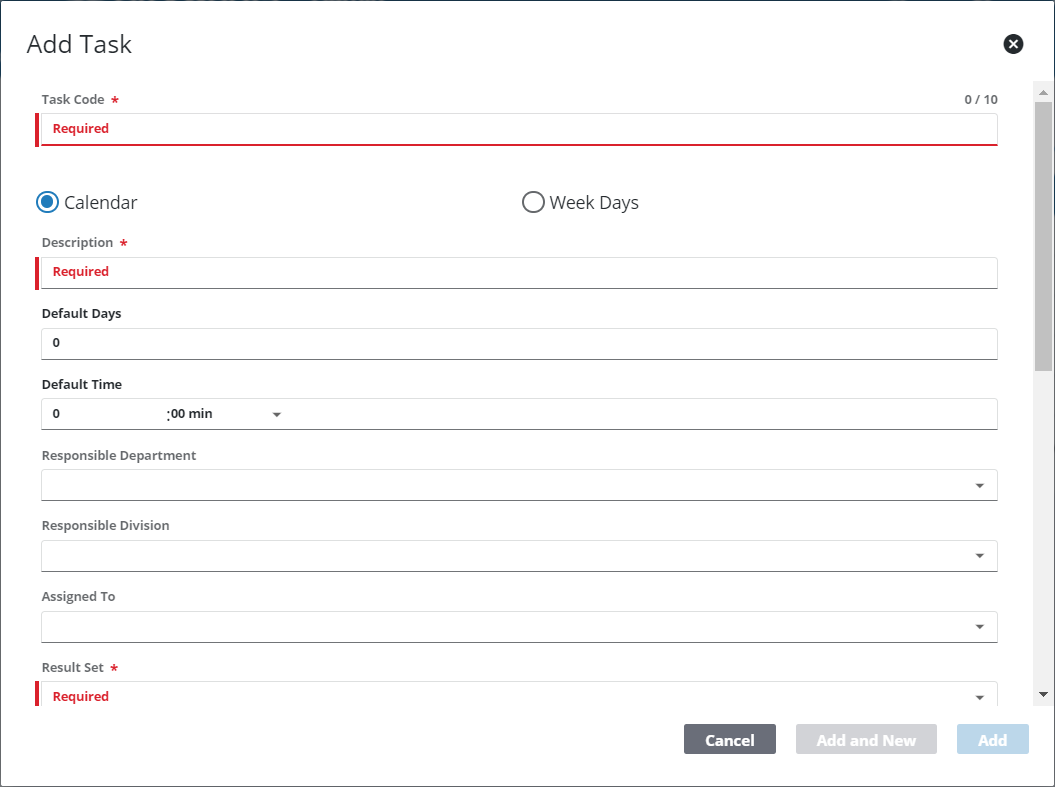 - Decide whether the duration of the task is measured in Calendar or Week Days and select the appropriate option. Then enter the average number of days and hours you expect the task to take in the Default Days and Default Time fields.