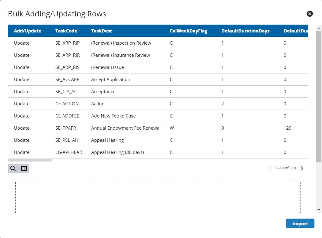 Multiple task records can be exported or imported at once using CSV files. Bulk import actions can be used for adding new records and editing existing records.