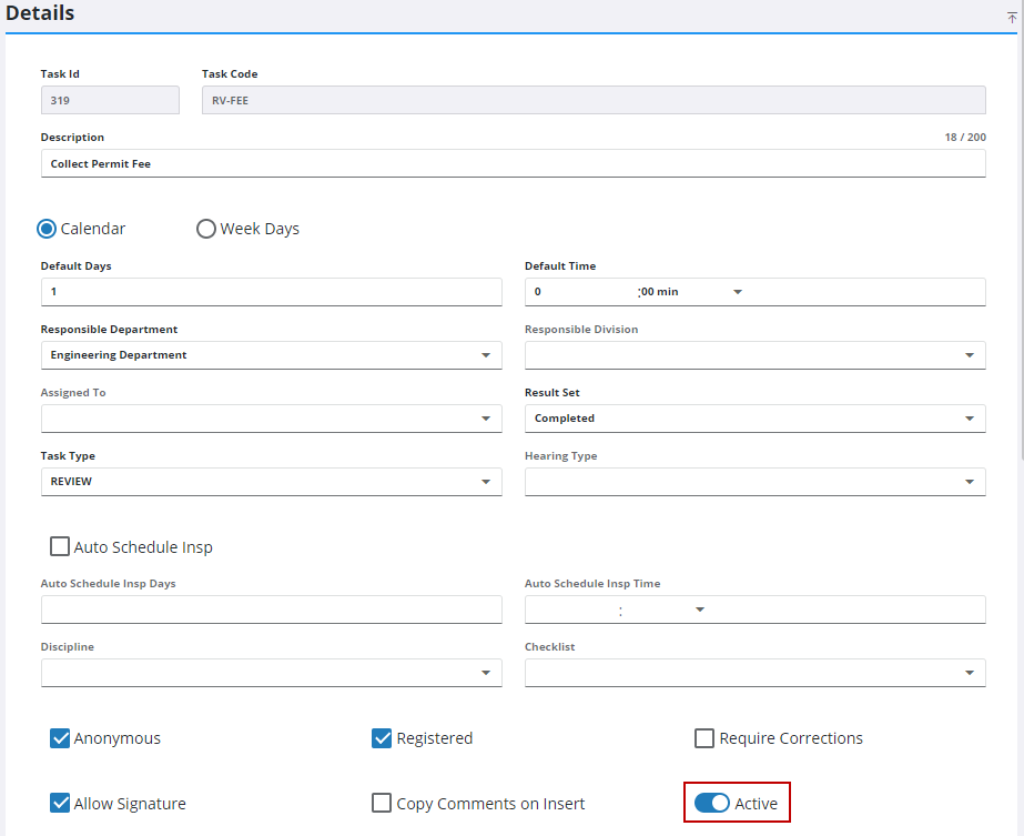 - On the Details panel, turn off Active. This allows you to deactivate the task so it cannot be added to a case template, but it can still be used as a search parameter and is still listed with historical data.