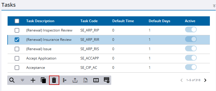 IMPORTANT: Trimble strongly recommends that you do not remove a task if it has been used on a case template because it deletes the link in the database and leaves orphaned task data.