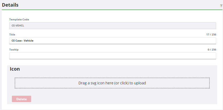 - To add an image, either click the box in the Icon section to browse to the file or drag a file and drop it where it says Drag a svg icon here (or click) to upload.