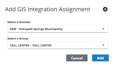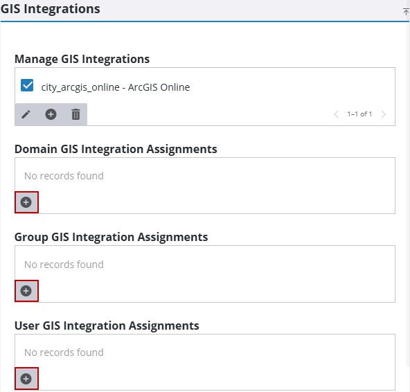 - Click Add record under Domain, Group, or User GIS Integration Assignments sections.