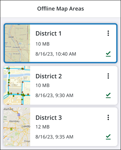 You can create and download multiple offline map areas associated to a single web map in advance to have map views while disconnected from the internet and improve offline workflows. After an offline map area has been created, you can download it, view its file size and sync status, switch between different areas, refresh it for the latest updates, and clear it from your device.