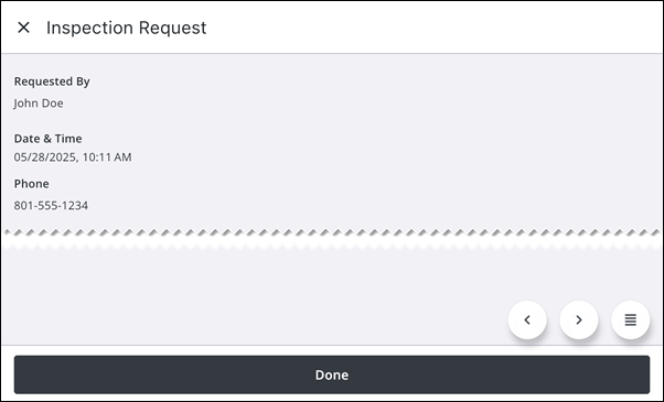 When a task has an inspection request, details including the Requested By user, the request Date & Time, and Phone number can be viewed.