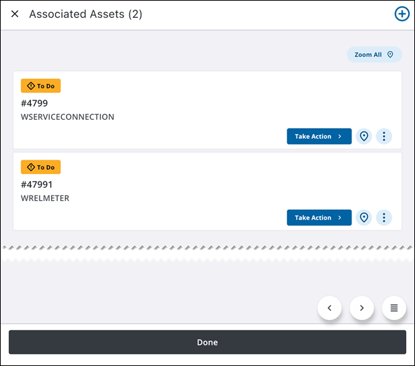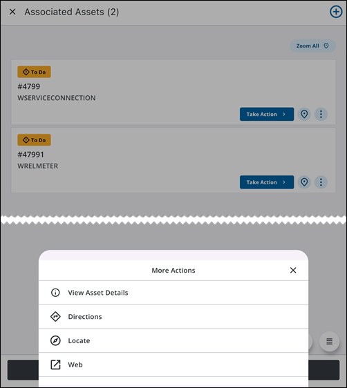 - Tap Zoom All to zoom to all associated assets or tap the Map icon to view a single associated asset.