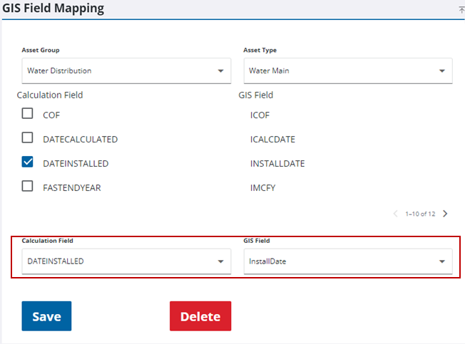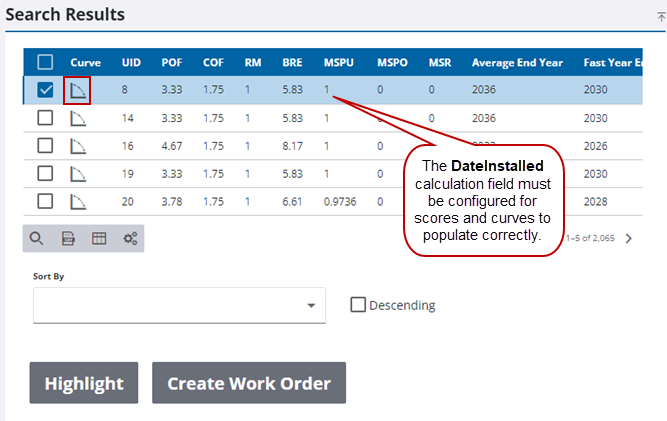 IMPORTANT: The DateInstalled calculation field must be configured with the correct GIS field for the asset scores and asset curve to populate correctly. See GIS Field Mapping for more information.