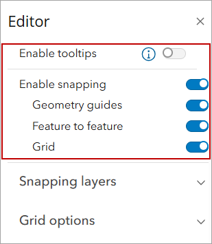 You can define settings, such as enable tooltip text and use the snapping controls to snap new or existing features to points on the map.