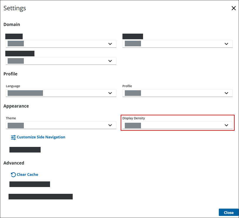 2. Click the Display Density drop-down list. The Standard density is applied automatically when you first log into the app until a different density is selected.