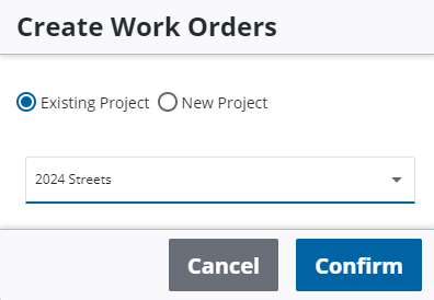 - To associate the work orders to an existing project, select Existing Project and select the project from the drop-down list.