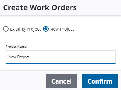 - To associate the work orders to a new project, select New Project and enter the Project Name.