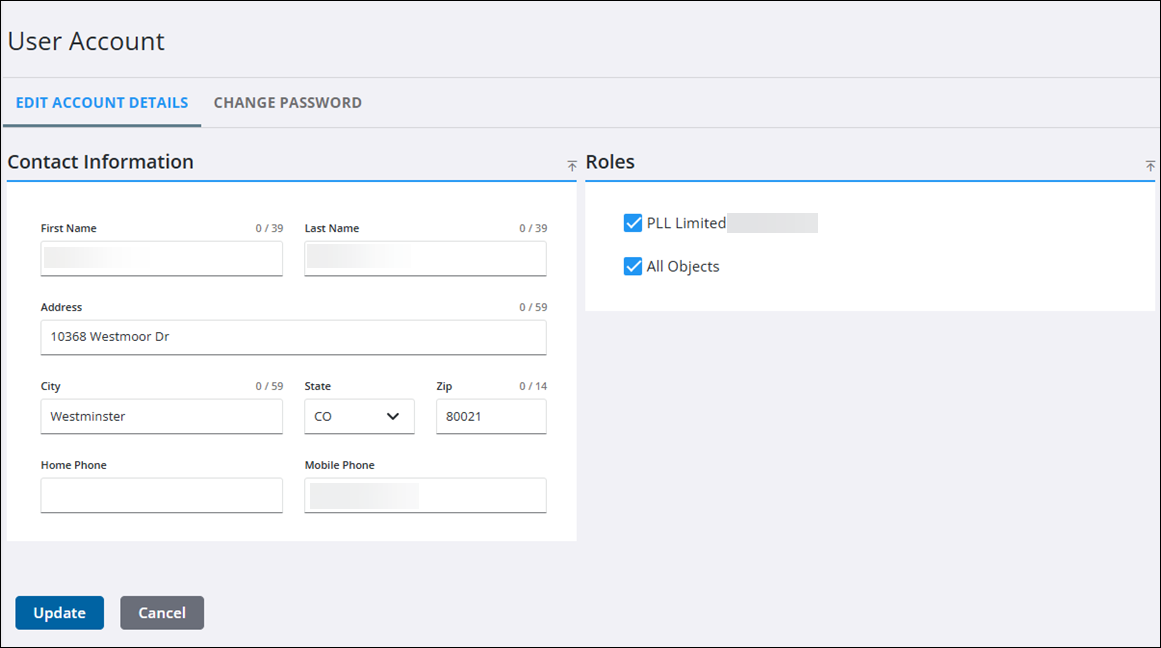 From the Edit Account Details tab, you can update contact information and the roles you are assigned to.