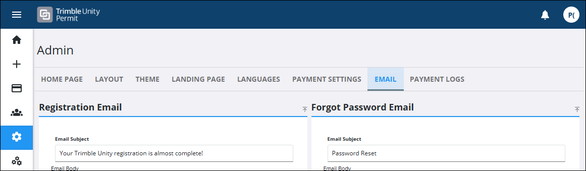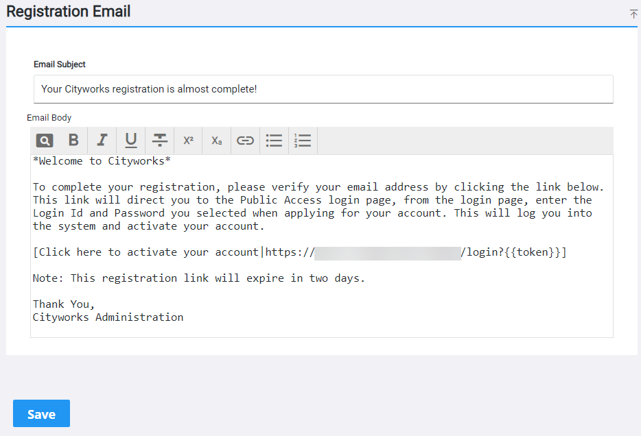 - On the Registration Email panel, update the Email Subject and Email Body fields as desired.