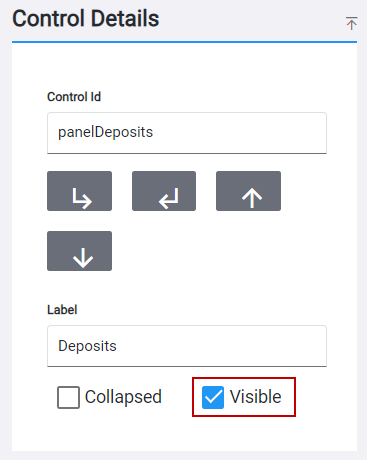 - In the Control Details panel, select the Visible check box to make the control visible or click to clear the check box to hide the control.